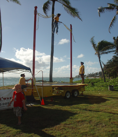 Trampoline-   Feel the excitement of jumping in the air doing flips and rolls with a Bungee cord system that safely propels jumpers up to 24 feet in the air.  Easy to move and operate and fun for all ages!